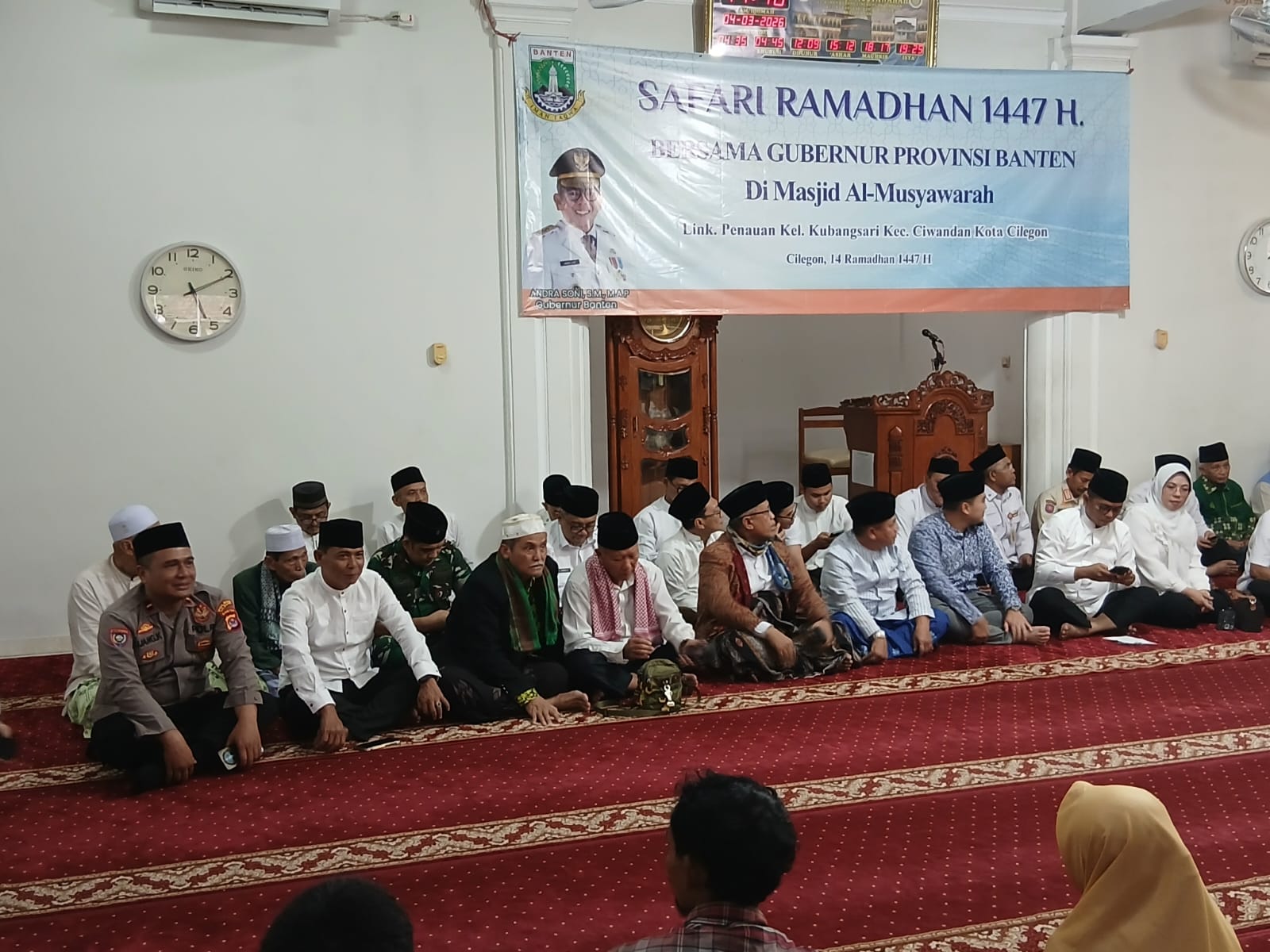 Cilegon - Bhabinkamtibmas Polsek Ciwandan Polres Cilegon Polda Banten AIPDA Asep Karyudin hadir dan mengamankan kegiatan Safari Ramadhan tingkat Provinsi Banten yang dilaksanakan di Masjid Al-Musyawarah, Jl. Sunan Bonang, Kelurahan Kubangsari, Kecanatan Ciwandan, Kota Cilegon, Kamis (05/03/2026).