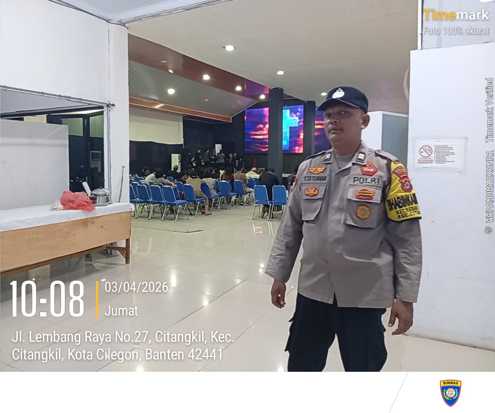 Cilegon - Wujud nyata pelayanan dan kehadiran Polri di tengah masyarakat ditunjukkan oleh Kapolsek Ciwandan Polres Cilegon Polda Banten KOMPOL Achri Dwi Yunito Dalam Pelaksanaan Pengamanan kegiatan keagamaan di Rumah Ibadah Pendeta Paul yang berlokasi di Lingkungan Tegal Cabe Kelurahan Citangkil Kecamatan Citangkil, Kota Cilegon,Jum’at (03/04/2026)