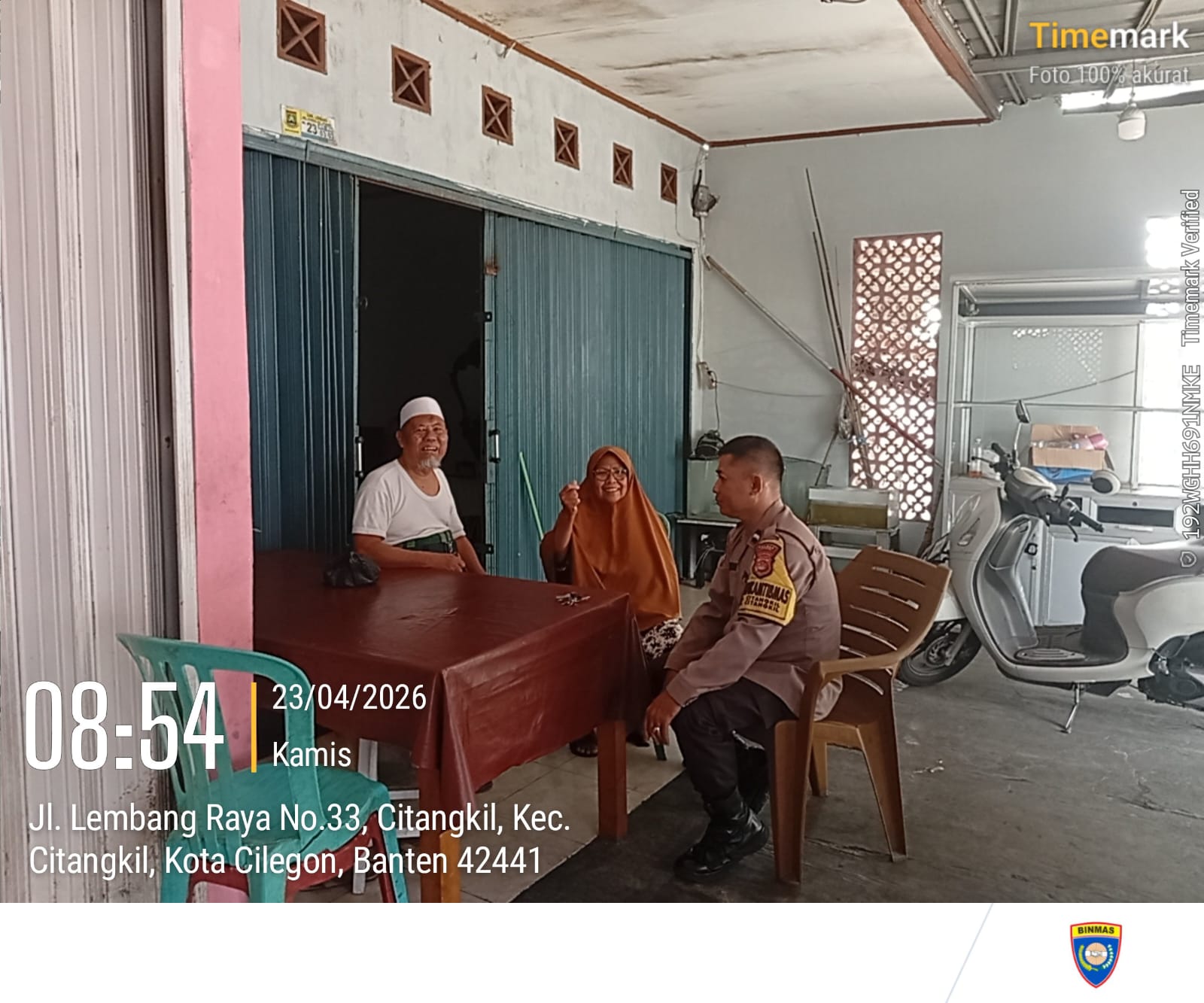 Cilegon - Bhabinkamtibmas Polsek Ciwandan Polres Cilegon Polda Banten Menyapa warga serta Ajak warga Binaannya untuk berperan aktif jaga keamanan lingkungan serta jalin komunikasi agar tercipta situasi aman di daerah hukum Polsek Ciwandan Polres Cilegon Polda Banten, Kamis (23/04/2026).