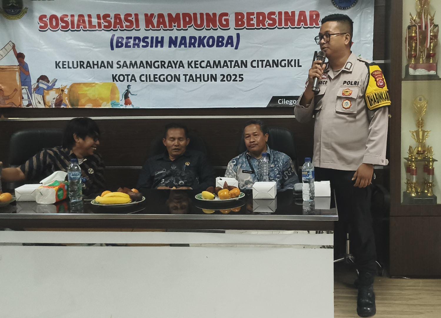 Cilegon - Bertempat di Aula Kantor Kelurahan Samangraya, Bhabinkamtibmas Kelurahan Samangraya Polsek Ciwandan Polres Cilegon Polda Banten BRIPKA Asep Karyudin Hadiri Sosialisasi Kampung Bersih Narkoba (Bersinar), Kamis (02/10/202).