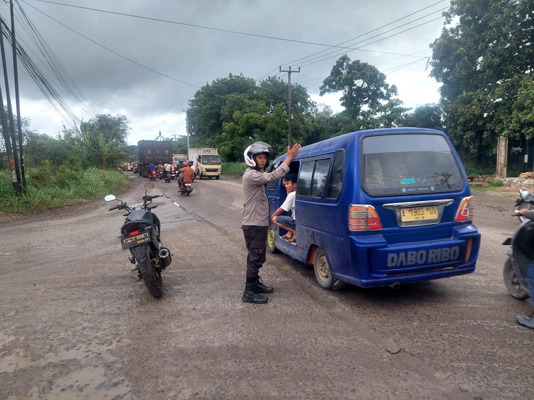 Strong Poin Sore Hari, Bripka Bambang Personil Polsek Bojonegara Pengaturan lalu lintas Di Jalan Raya PT Bam Bojonegara