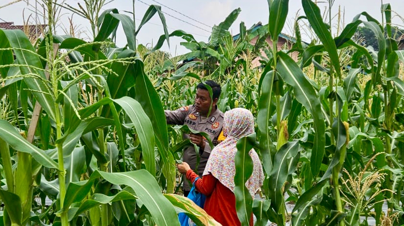 Bhabin Polsek Pulomerak Bahu Membahu dengan Kelompok Tani Lakukan Penanaman Jagung di Lebakgede