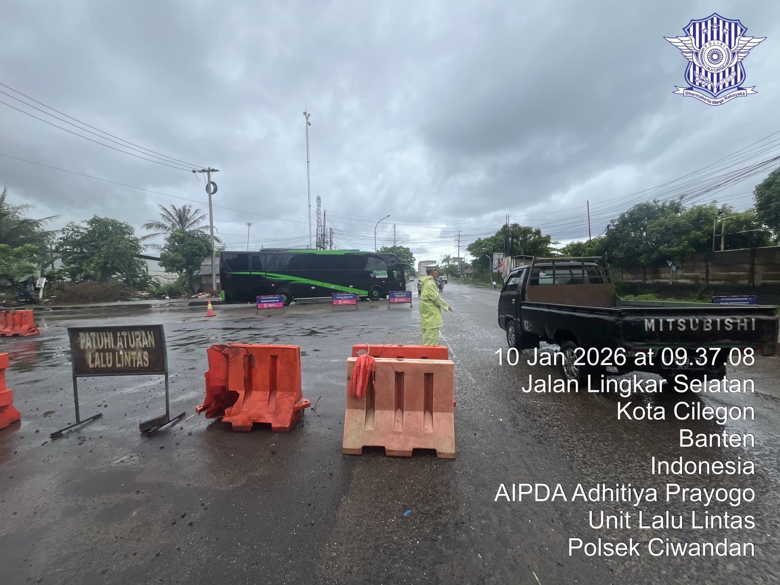 Cilegon - Personil Unit Lantas Polsek Ciwandan Polres Cilegon Polda Banten melaksanakan kegiatan monitoring jalur wisata di depan Pos Lantas JLS Ciwandan, Sabtu (10/01/2026).
