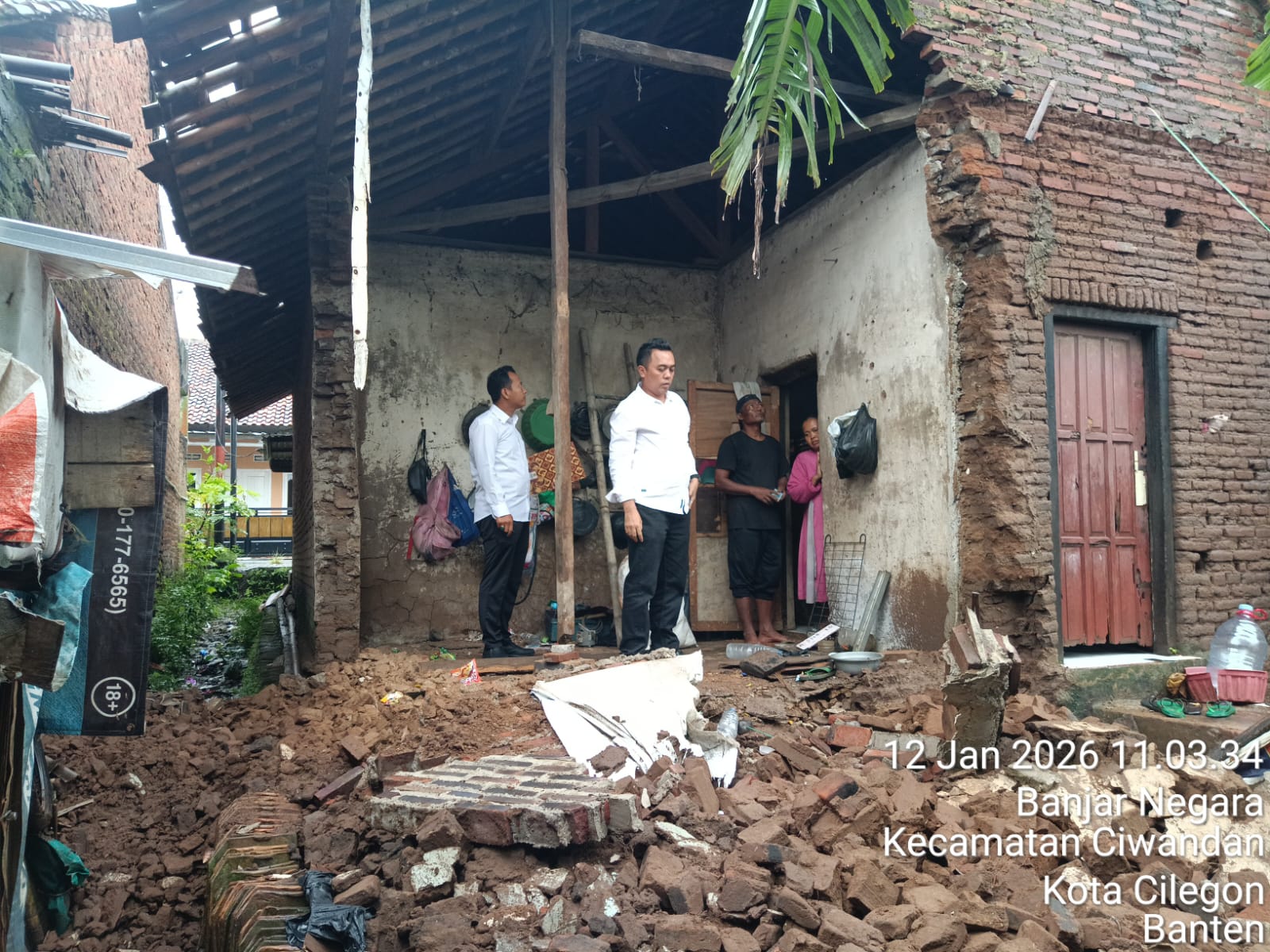 Cilegon - Personil Polsek Ciwandan Polres Ciegon Polda Banten Mengecek Dan Monitoring Sebuah rumah di Lingkungan Temugiring RT 002 RW 001 Kelurahan Banjarnegara Kecamatan Ciwandan Kota Cilegon Yang rubuh akibat hujan deras yang disertai angin pada Senin (12/01/2026).