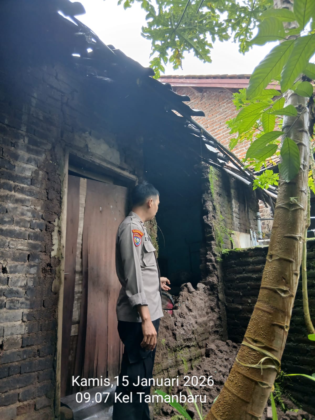 Cilegon - Bhabinkamtibmas Kelurahan Tamanbaru AIPDA Edianto, mengunjungi Ibu Marni yang rumahnya roboh bagian dapur akibat hujan angin di Lingkungan Sondol Rt. 03/02 Kelurahan Tamanbaru Kecamatan Citangkil, Kamis (15/01/2026).