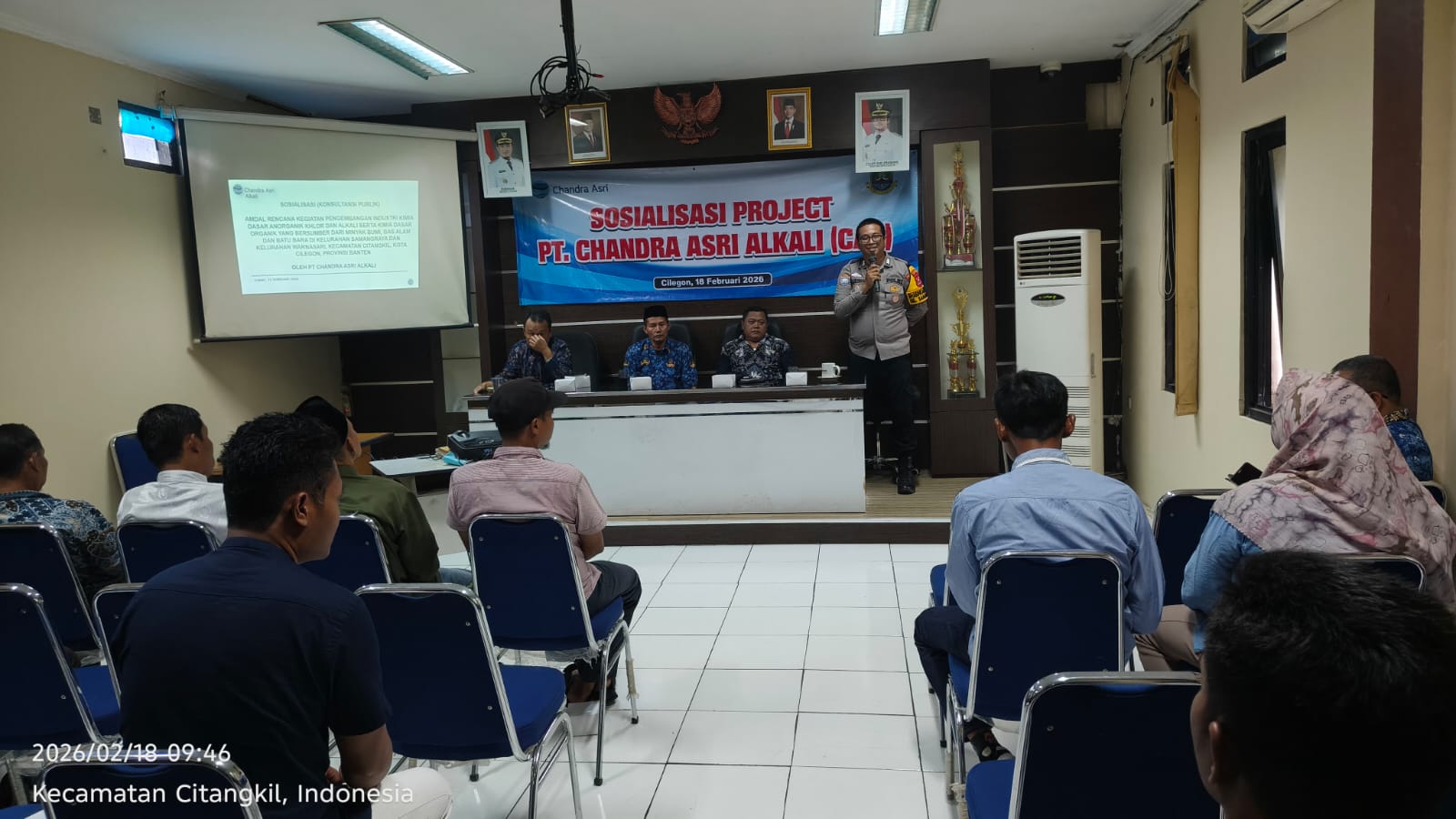 Kapolres Cilegon Polda Banten AKBP Dr. Martua Raja Taripar Laut Silitonga Melalui Kapolsek Ciwandan Polres Cilegon Polda Banten KOMPOL Achri Dwi Yunito Mengatakan Banhwa Kegiatan ini merupakan tindak lanjut dari Kelurahan Samangraya setelah pelaksanaan Sosialisasi Amdal PT CAA pada hari Jumat tanggal 13 Februari 2026. Tujuan kegiatan ini adalah untuk menyampaikan Sosialisasi Amdal PT CAA kepada Masyarakat Kel. Samangraya melalui Perangkat RW dan RT serta Karang Taruna dan Toga atau Tomas.
