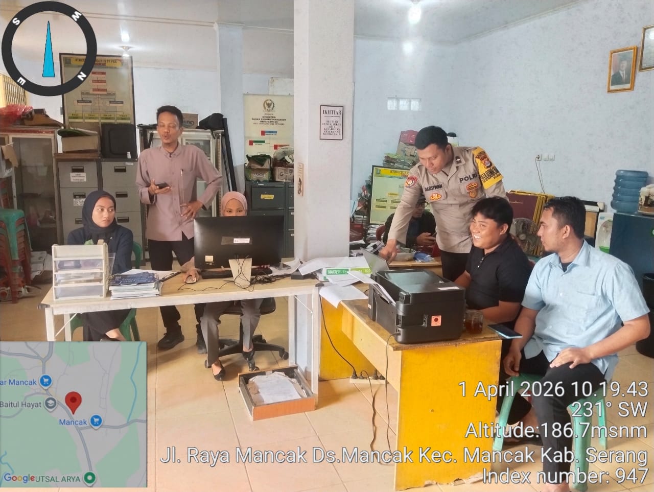 Cilegon – Polres Cilegon Polda Banten, dalam rangka ciptakan situasi kamtibmas kondusif Bhabikamtibmas Desa Mancak Kec. Mancak AIPDA Darsiwan laksanakan himbauan kamtibmas dengan Staf Desa Mancak dan Masyarakat, agar selalu menjaga kamtibmas secara bersama-sama di wilayah. Rabu (01/04/2026).