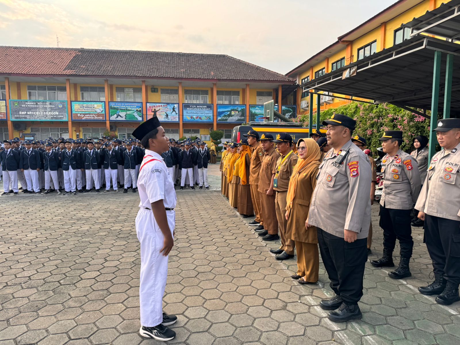 Cilegon ~ Satbinmas Polres Cilegon Polda Banten dipimpin oleh PS Kasatbinmas Polres Cilegon IPTU Muhyidin bersama dengan personel Satbinmas Polres Cilegon melaksanakan kegiatan Polisi Peduli Pendidikan dengan menjadi Pembina Upacara di SMPN 2 Cilegon, Senin (20/04/2026).